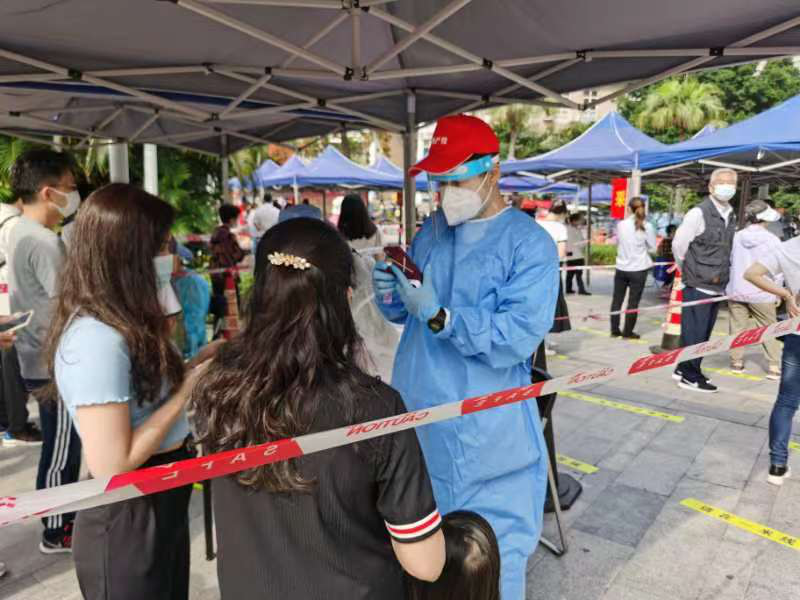 有召必应 “青”力以赴 按照海珠区的安排,产投志愿者们分配在沙园街道光大社区乐峰广场南采样点和北采样点协助核酸检测。大家满怀着“防疫有我,请党放心”的激情和责任感,全身心投入到工作中,与社区人员、医务人员共同战斗。志愿者们头戴产投集团小红帽,换上口罩和防护服,化身为信息员,宣传员、秩序员、服务员、后勤员,哪里有需要哪里就能见到产投集团的“小红帽”,保证了检测过程井然有序、顺利进行。沙园街道有关负责人赞扬道:“感谢产投志愿者的大力支持,你们有召必应,助力沙园街道成为全海珠区最早完成100%核酸检测的街道。”