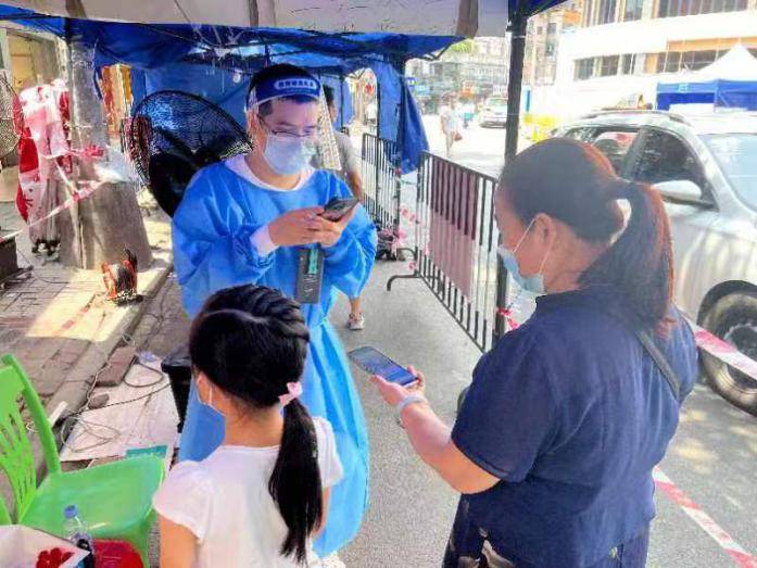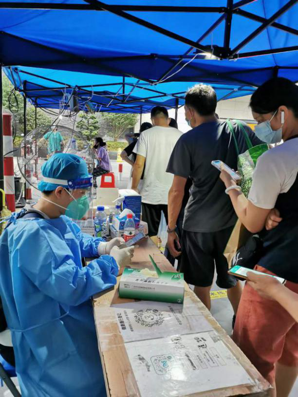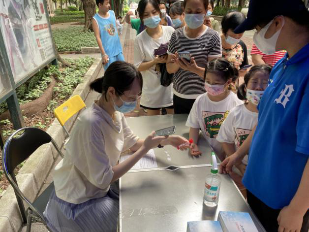 落实关爱,慰问轮换。前线在作战、后方做保障。当天天气较热,全员核酸工作量大、时间长。为保障队员健康安全,各单位安排了后备队员,对前线人员进行轮换,确保人员不脱岗,效率不下降。同时,集团党群工作部也做好物资保障,下午到各个负责社区开展慰问送清凉,力保全员安全和任务完成。从早上8点30分“战斗”到晚上10点结束,产投集团志愿者工作认真负责,耐心细致服务社区居民,有的年长居民心疼说道:“靓仔,满脸的汗水擦一擦了”,站了一天的他们笑笑说“不累,不碍事的”,他们坚持到最后一个居民做完核酸检测,圆满完成当天的抗疫支援工作才回家。