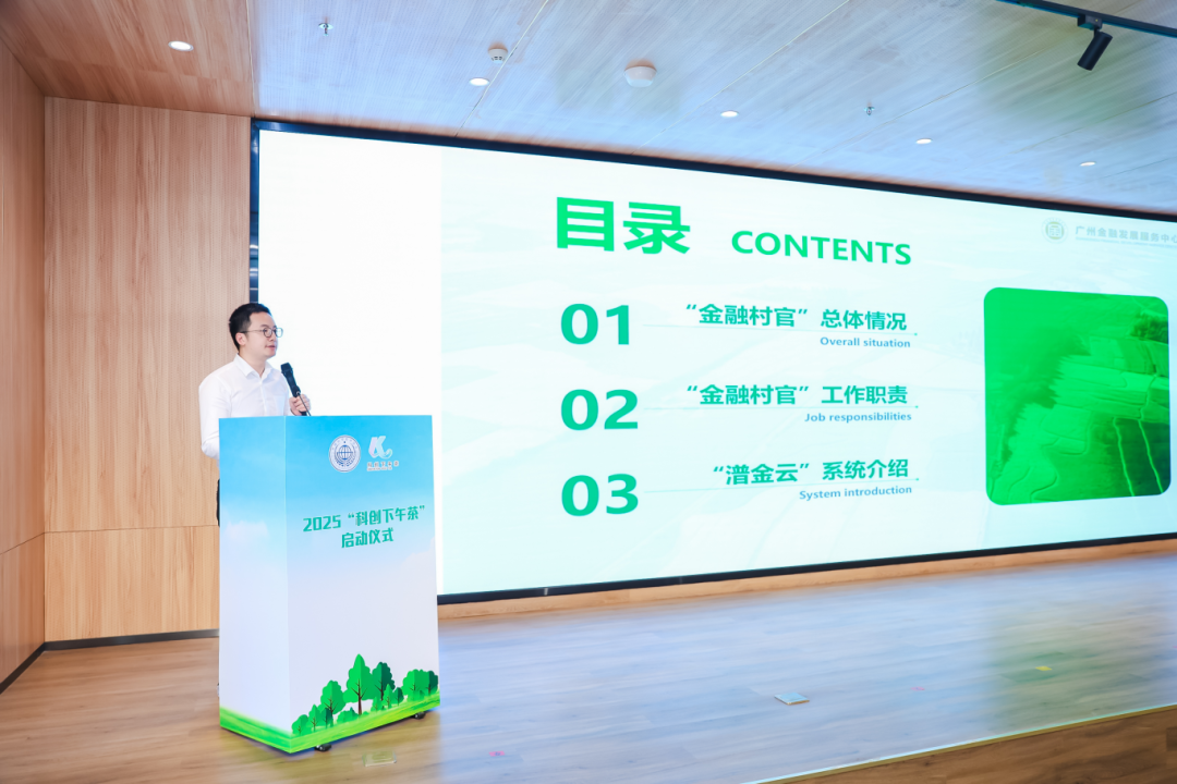 在政策宣讲环节,广州金融发展服务中心介绍了“金融村官”总体情况和工作职责, 通过金融机构与科技企业、高校、科研机构的紧密合作,助力乡村振兴和产业发展。
