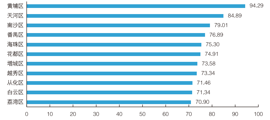 五是各区创新发展水平持续提升,各有特色。2023年广州各区齐头并进,创新发展差距在逐渐缩小,创新发展不平衡的现状得到改善。其中,黄埔区综合创新水平稳居全市第一,企业创新表现突出,创新环境优越,多项指标得分在广州11区中均位列第一;天河区创新水平表现优异,综合得分居全市第二,技术合同成交额、财政科技支出两项指标得分居全市第一;南沙区创新发展势头较强,综合得分居全市第三,研发投入强度稳步提升,高新技术产业发展势头迅猛;番禺区科技企业发展迅速,创新环境不断改善,规上企业R&D经费支出和产业高质量发展指标得分居全市第二。